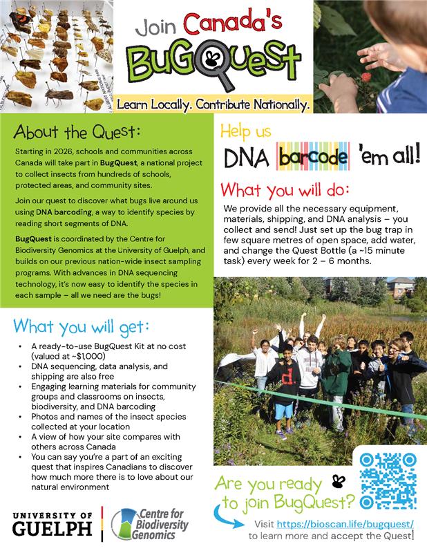 As part of Genome Canada funding requirements, biodiversity data generated through BugQuest will be shared publicly following project completion and analysis. This may include site locations, species (taxonomic) lists, and summary reports. No personal information will be shared.
